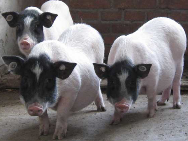 巴馬香豬,個(gè)體矮、小、短、圓,性野早熟。外貌顏色特征主要表現(xiàn)為兩頭黑、中間白,部分個(gè)體背腰部稍帶黑斑,額頭有白線或倒三角型白斑,俗稱“兩頭烏”。